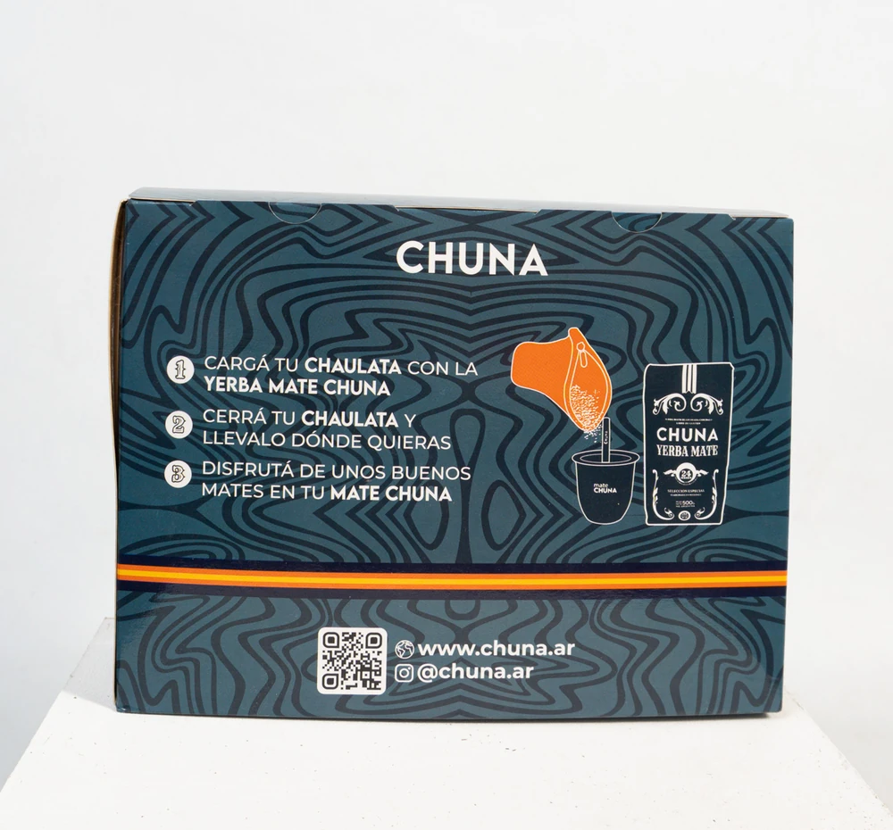 Combo Mate Premium Este combo está pensado para los amantes del mate que buscan una experiencia auténtica y completa. Contiene todo lo necesario para disfrutar de un buen mate, desde el recipiente ideal hasta nuestra yerba mate de excelente calidad. Caja packaging Contiene 1 Chaulata yerbera 350 gr, confeccionada en Cire guata impermeable, 1Mate Chuna acero inoxidable, 1 Bombilla de acero, 1 Yerba Mate Chuna 500 gr
