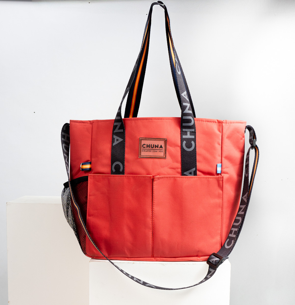 Canasta confeccionada en microfibra 1005 (75%PVC – 25% Poliester) Manija, correa regulable y llavero 2 bolsillos frontales, interior con compartimento para termo, mate y bombilla Bolsillo interno de red y mosquetón cuelga llaves Medidas: Alto 30cm, Ancho 28cm, Base 14cm Peso: 390grms