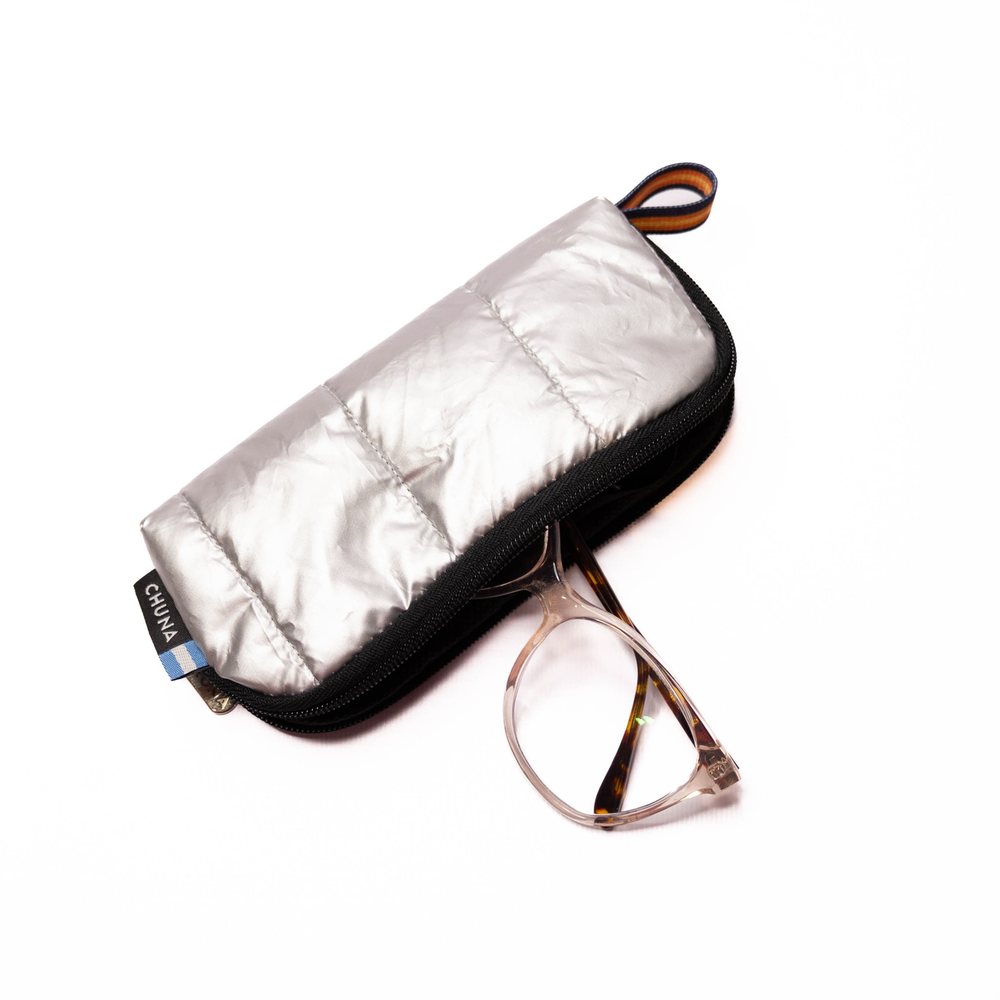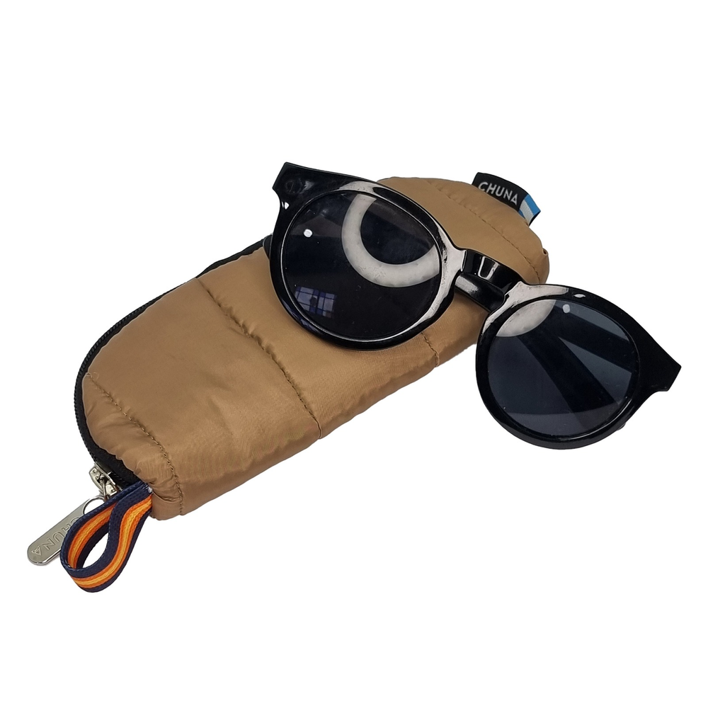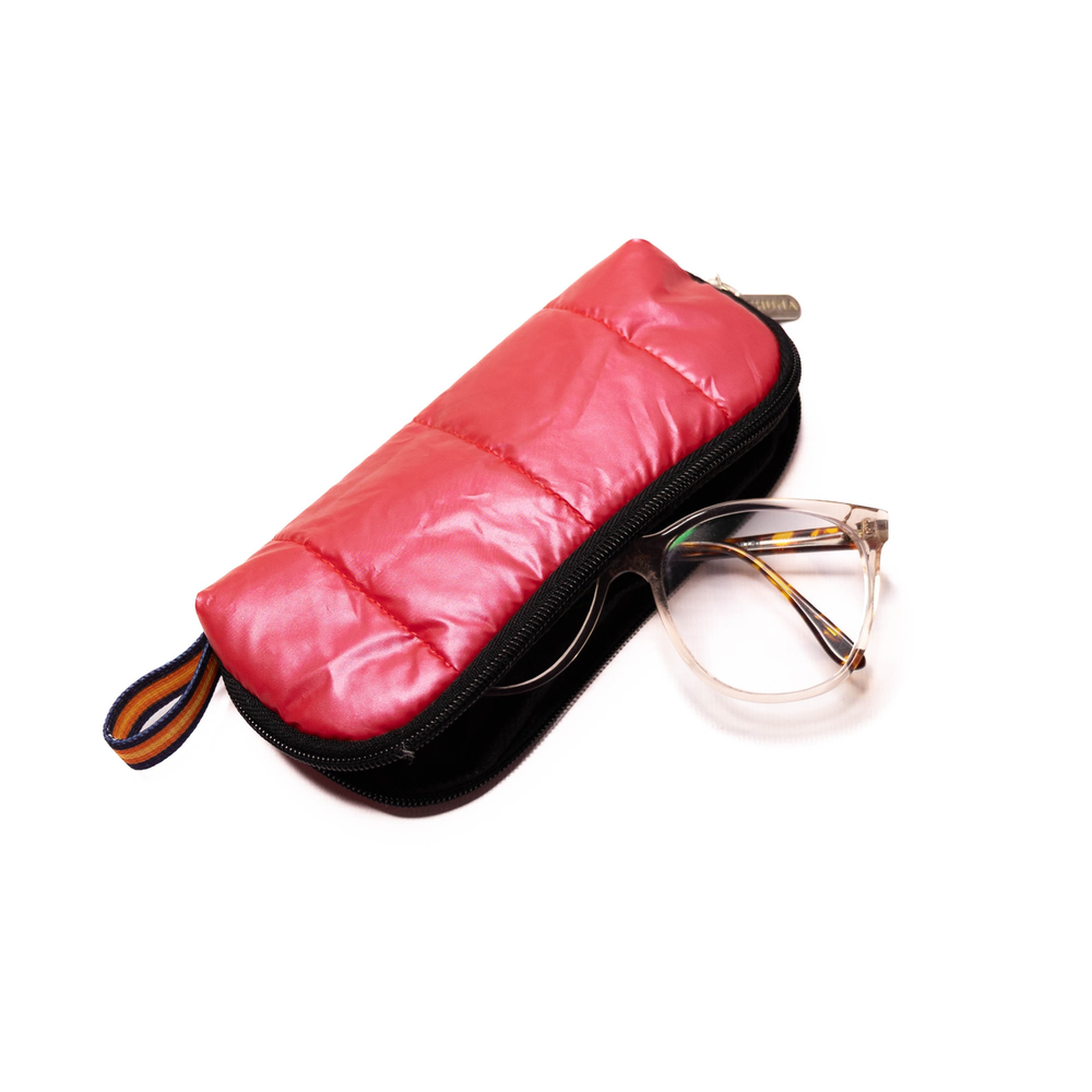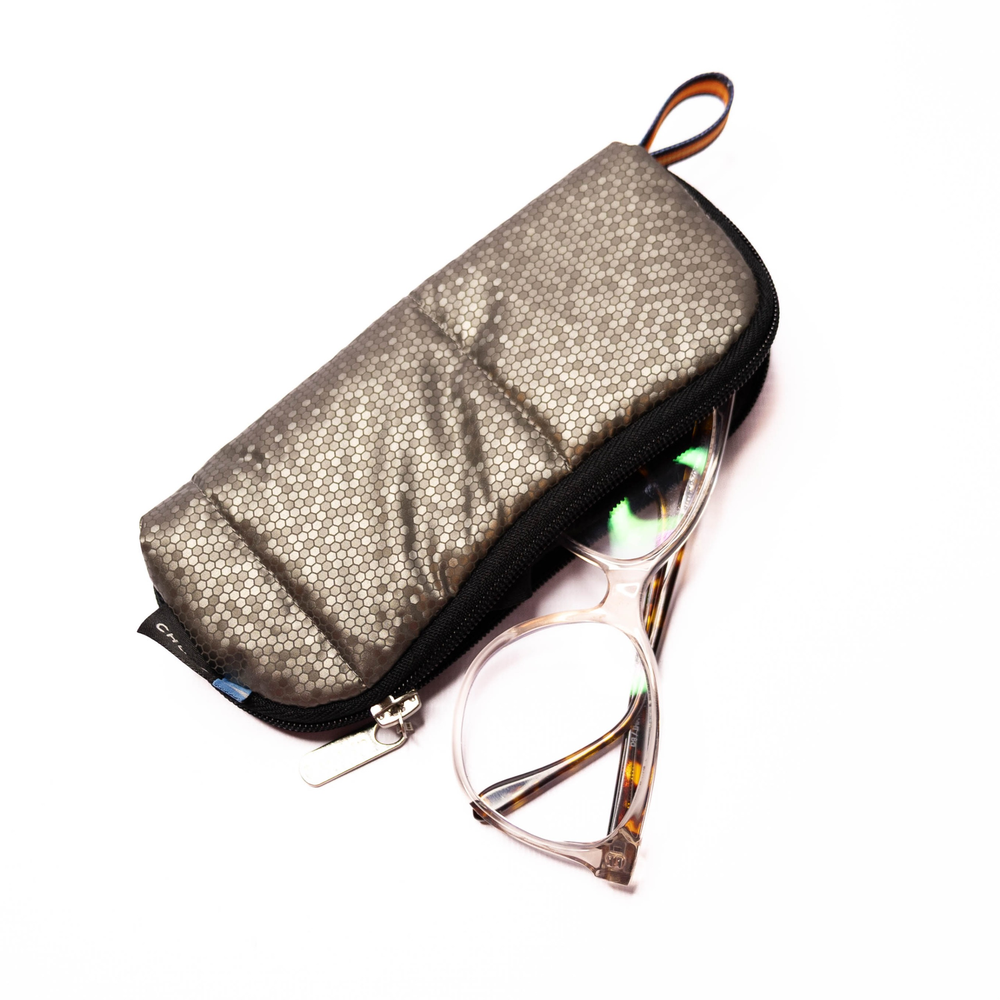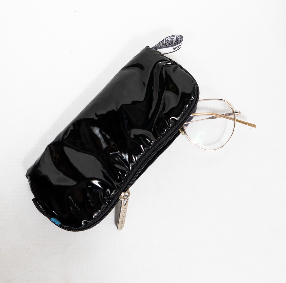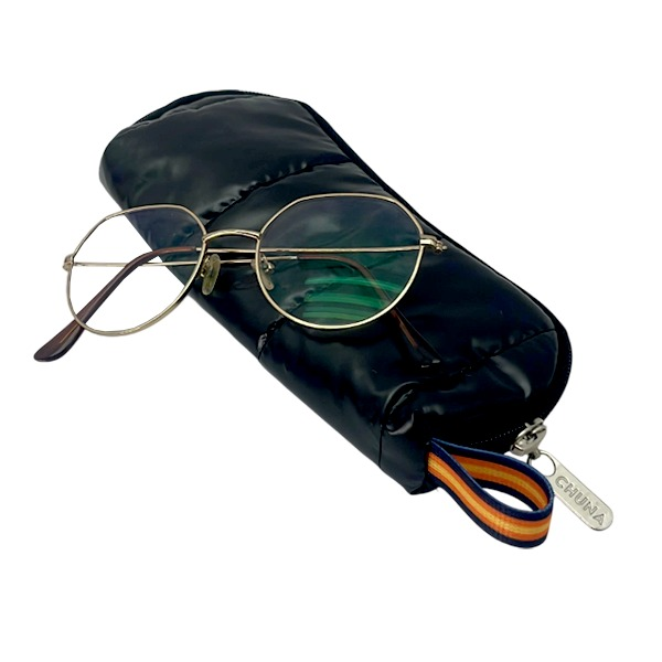 Estuche para anteojos con cierre. Incluye paño para limpiar los lentes en el interior.