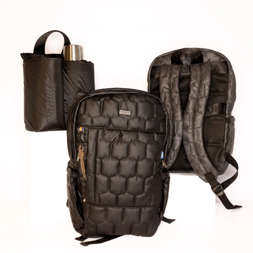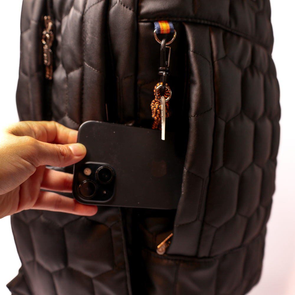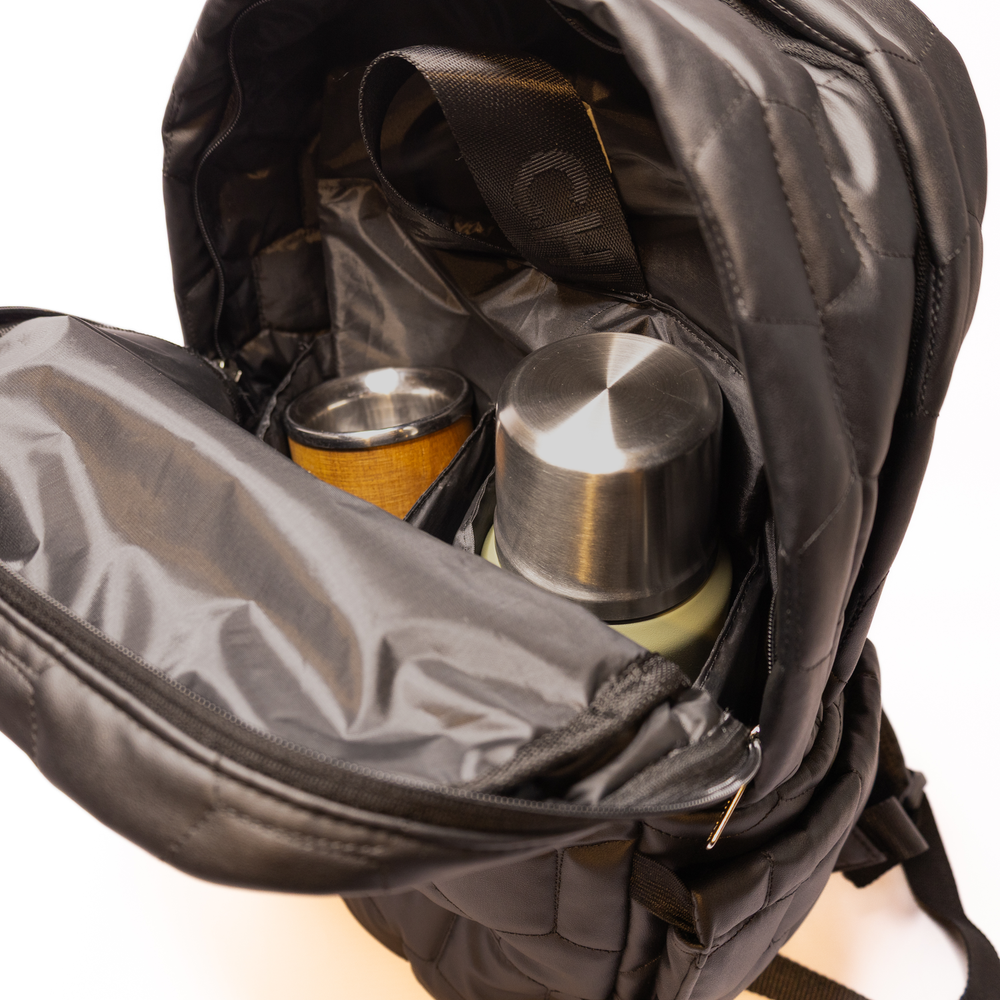 Mochila de Viaje, confeccionada en poliéster de alta resistencia y textura matelasseada con patrón hexagonal. Diseñada para acompañarte en cada aventura con elegancia y practicidad. El interior está completamente forrado en ciré, lo que aporta protección contra la humedad y facilita la limpieza. Su diseño incluye bolsillo frontal con cierre para objetos de uso frecuente y un bolsillo oculto en el dorso, para guardar pertenencias de valor con mayor seguridad. bolsillos laterales en ambos lados, ideales para botellas. Las correas anchas y regulables aseguran un calce cómodo. La espalda semi-rígida de doble frontura aporta soporte y estabilidad sin comprometer la comodidad., y banda trasera que permite sujetarla a la manija extensible del carry on, facilitando su transporte En el interior, encontrarás un compartimento acolchado para notebook y un compartimento independiente para guardar artículos personales. Pensada para quienes buscan versatilidad, cuenta con un "matero desmontable", ideal para llevar tu kit de mate de forma organizada y accesible, aportando un toque único que convierte a esta mochila en una pieza distintiva tanto para el uso diario como para escapadas de fin de semana o viajes largos. Medidas: Alto 46 cm Ancho 28cm Base 15cm